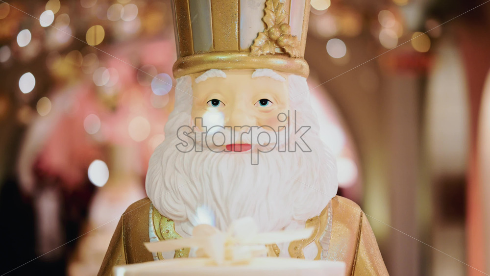 Close up of a Santa Claus figure inside a festive Christmas installation with warm lights and ornaments Royalty Free Stock Video Footage