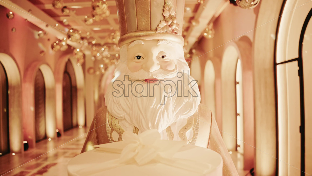 Close up of a Santa Claus figure inside a festive Christmas installation with warm lights and ornaments Royalty Free Stock Video Footage