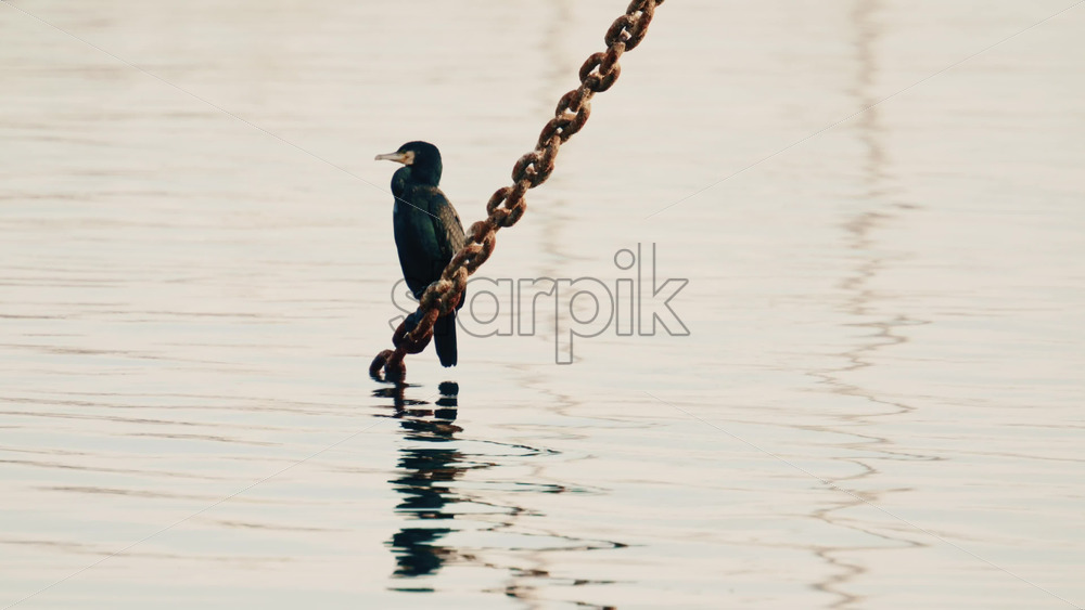 Close up of a seabird perched on mooring ropes above calm marina water Royalty Free Stock Video Footage