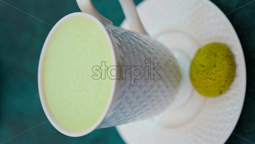 Close up of a smooth matcha latte with vibrant green foam in a white cup. Vertical Royalty Free Stock Video Footage