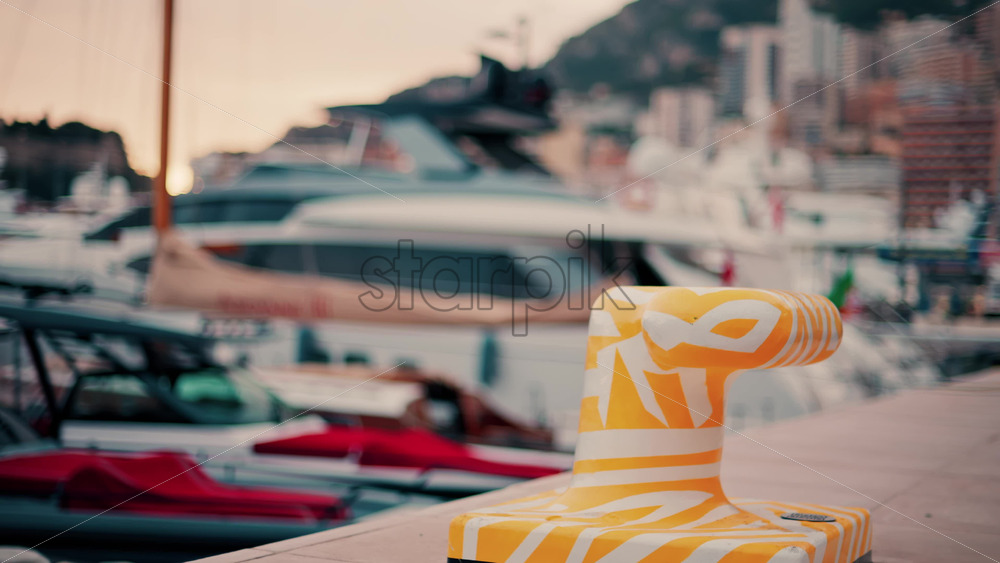 video Close up of a white and yellow dock cleat in a harbour with boats on the background Royalty Free Stock Video Footage