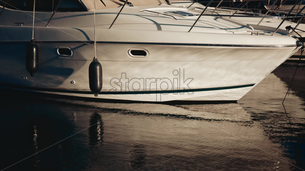 Golden sunlight shimmering on the side of a yacht floating on calm water Royalty Free Stock Video Footage