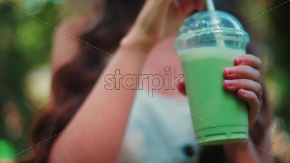 Close up of a woman drinking an iced matcha in the park, in sunlight Royalty Free Stock Video Footage