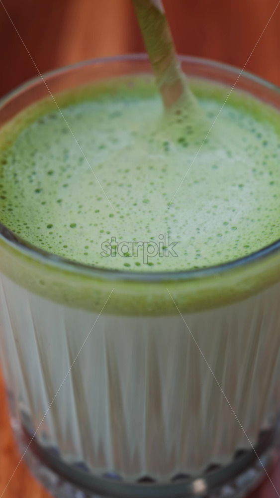 Close up of a matcha latte on a wooden table. Vertical Royalty Free Stock Video Footage