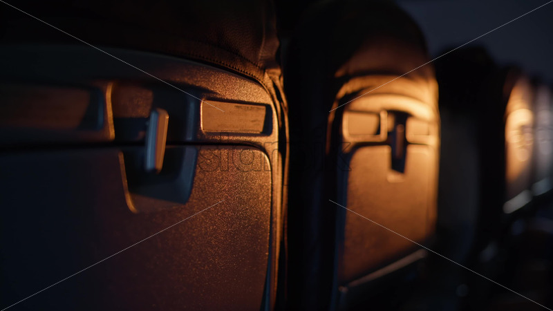 VIDEO Close up of black airplane seats in sunlight during a flight Royalty Free Stock Video Footage