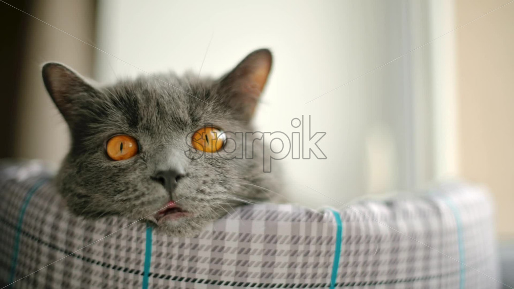 Close up of a British Shorthair cat looking around near a window Royalty Free Stock Video Footage
