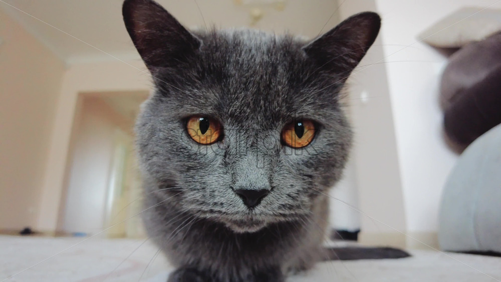 VIDEO British Shorthair cat with orange eyes lying on the floor, looking around Royalty Free Stock Video Footage