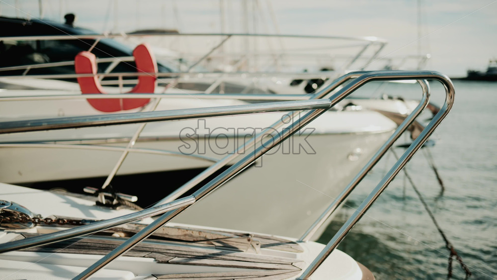 Close up of chrome railing and wooden deck of a luxury yacht docked in a marina under golden light Royalty Free Stock Video Footage