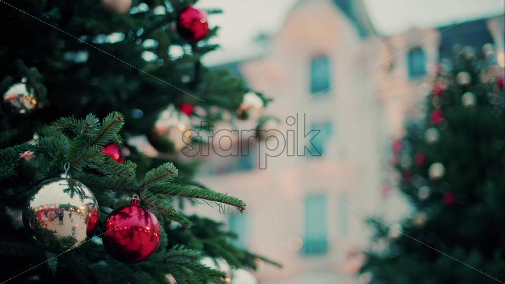 Video Monte Carlo , Monaco -December 23, 2024: Close up of decorations on a Christmas tree in front of the Monte Carlo Casino Royalty Free Stock Video Footage