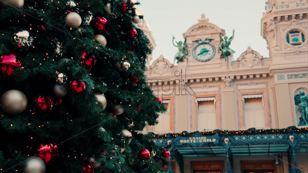 video Close up of decorations on a Christmas tree in front of the Monte Carlo Casino in Monaco in the evening Royalty Free Stock Video Footage