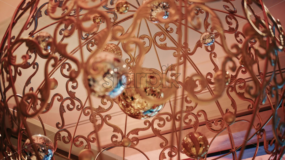 Decorative Christmas baubles suspended from an ornate structure, glowing under warm indoor lighting Royalty Free Stock Video Footage