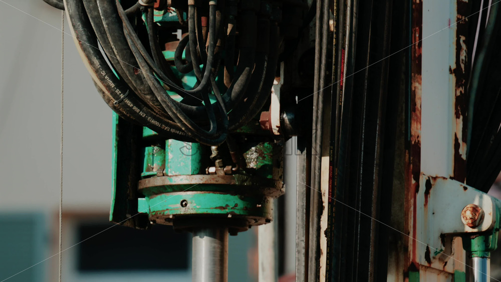 Close up of industrial drilling equipment with hydraulic cables and metal framework Royalty Free Stock Video Footage