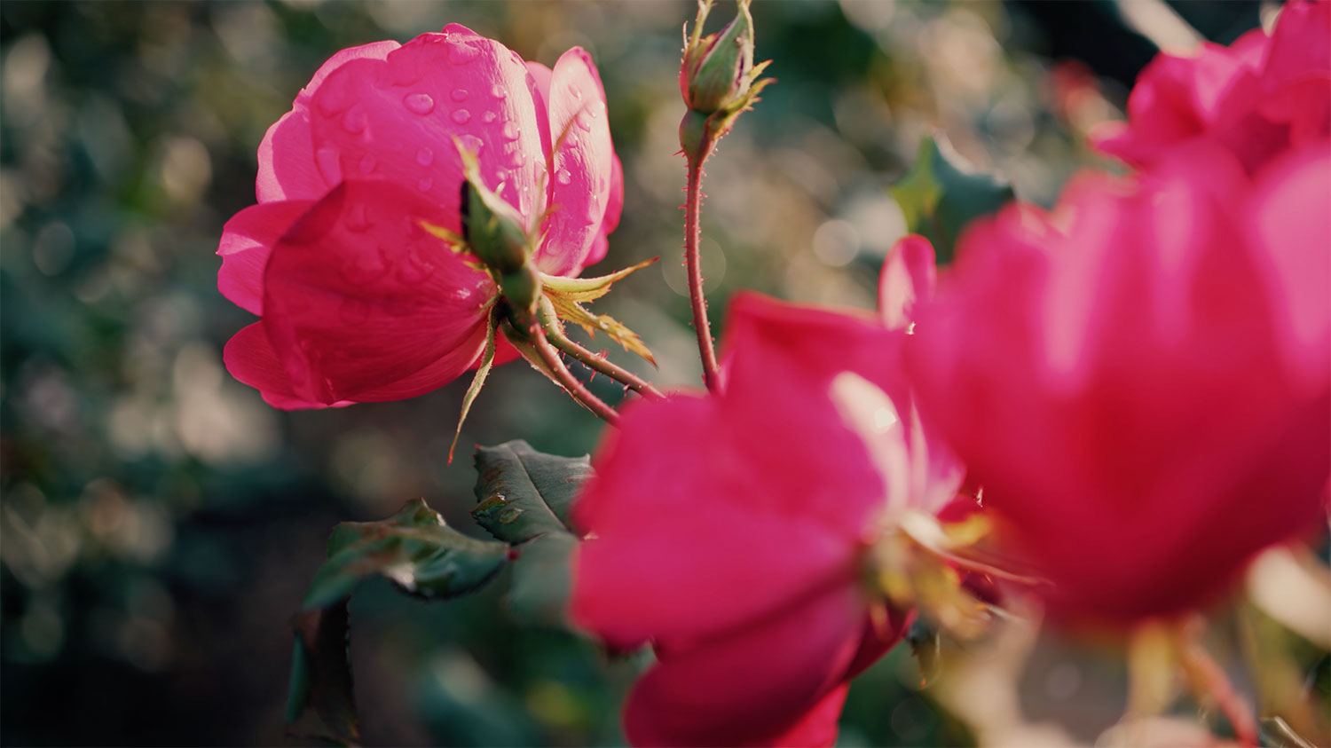 Close up of blooming pink roses in a park during golden hour, with warm sunlight shining through the petals Royalty Free Stock Video Footage