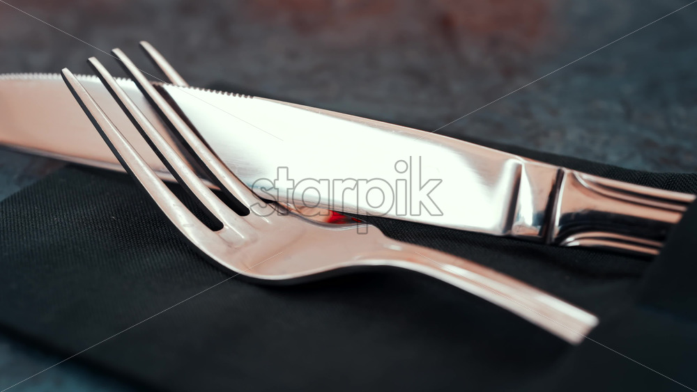 Close up of silver cutlery placed neatly on a dark napkin at a restaurant Royalty Free Stock Video Footage