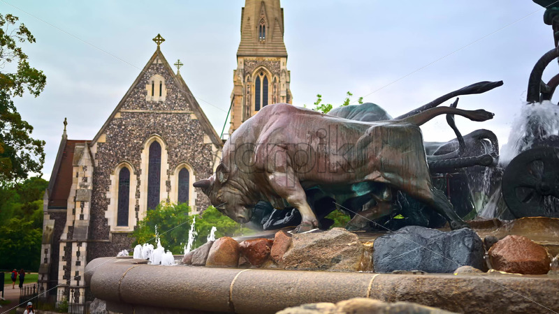 VIDEO Close up of the Gefion Fountain in front of St Alban’s Church in Copenhagen, Denmark Royalty Free Stock Video Footage