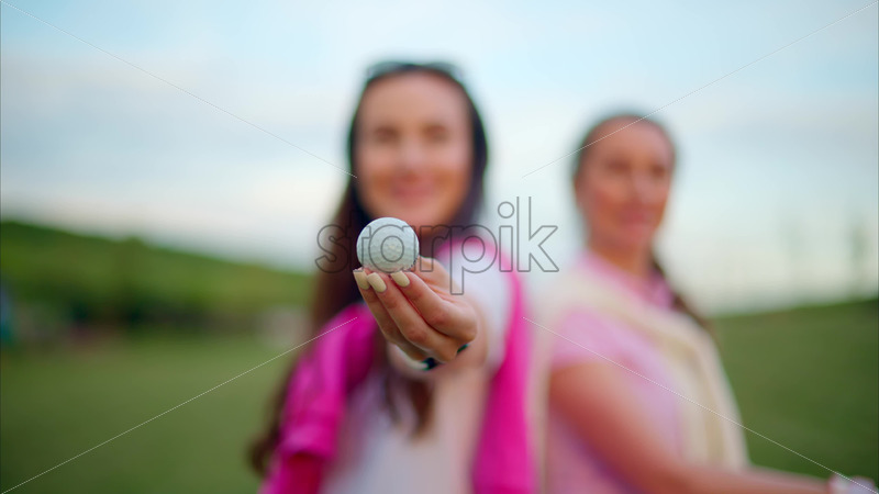 VIDEO Close up of two women in white and pink clothes holding a white golf ball on the course Royalty Free Stock Video Footage