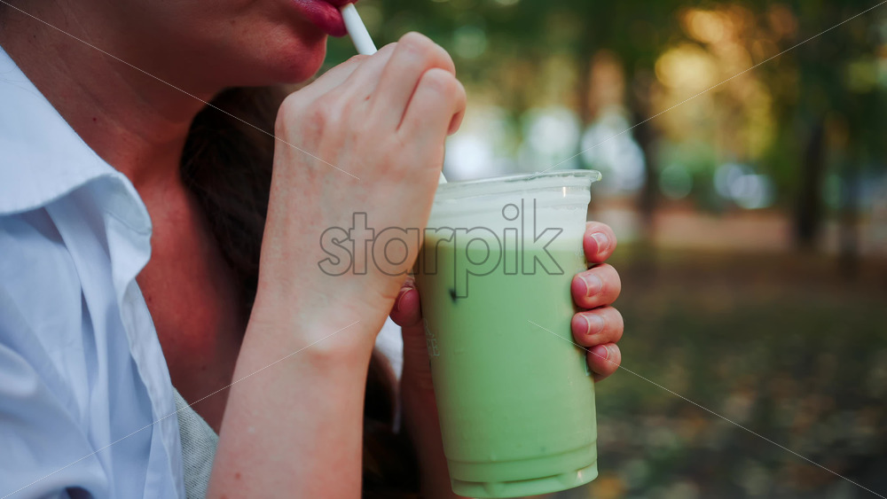 Close up of a woman drinking an iced matcha in the park, in sunlight Royalty Free Stock Video Footage