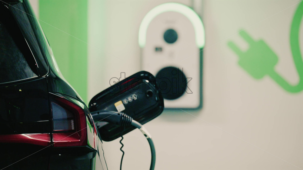 Close up view of a black electric car plugged into a charging station Royalty Free Stock Video Footage