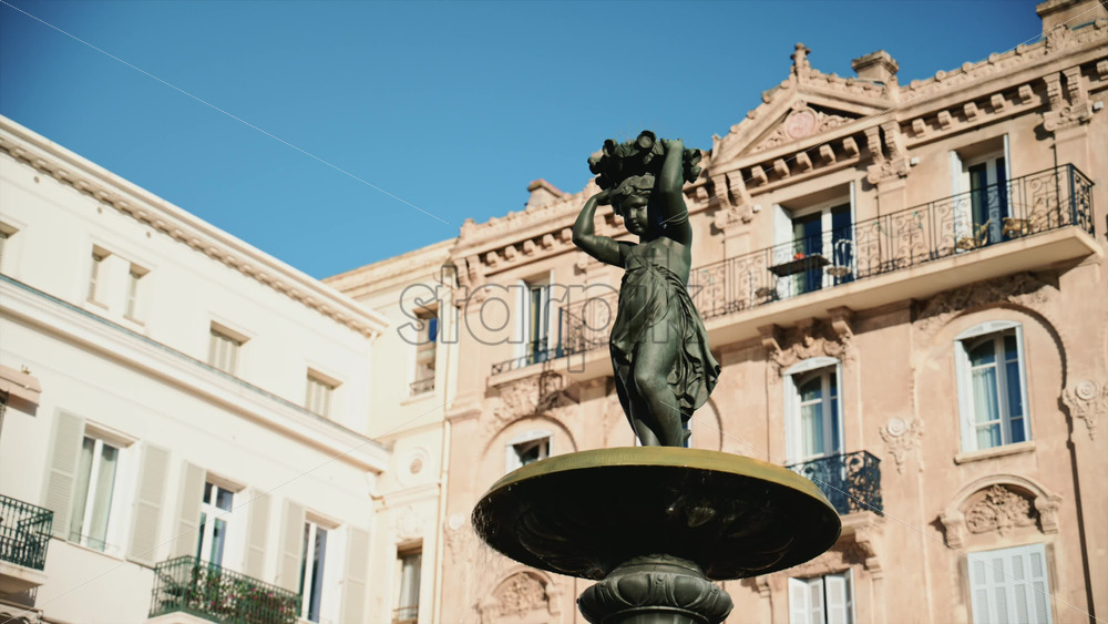 Close up view of a bronze fountain statue with flowing water, surrounded by classic architecture in the Place du General de Gaulle Royalty Free Stock Video Footage