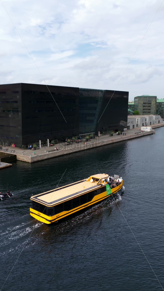 Copenhagen, Denmark – August 4, 2025: Aerial drone view of boat moving near the modern glass extension of the Royal Danish Library. Vertical Royalty Free Stock Video Footage