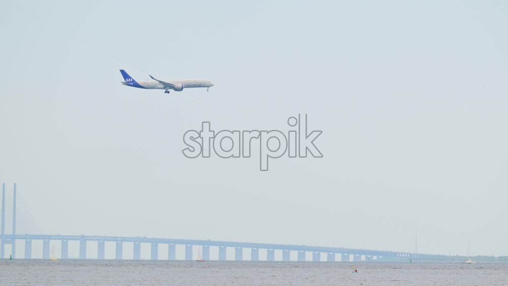 Copenhagen, Denmark – August 4, 2025: Airplane flying low over the ocean with the Oresund Bridge in the background Royalty Free Stock Video Footage