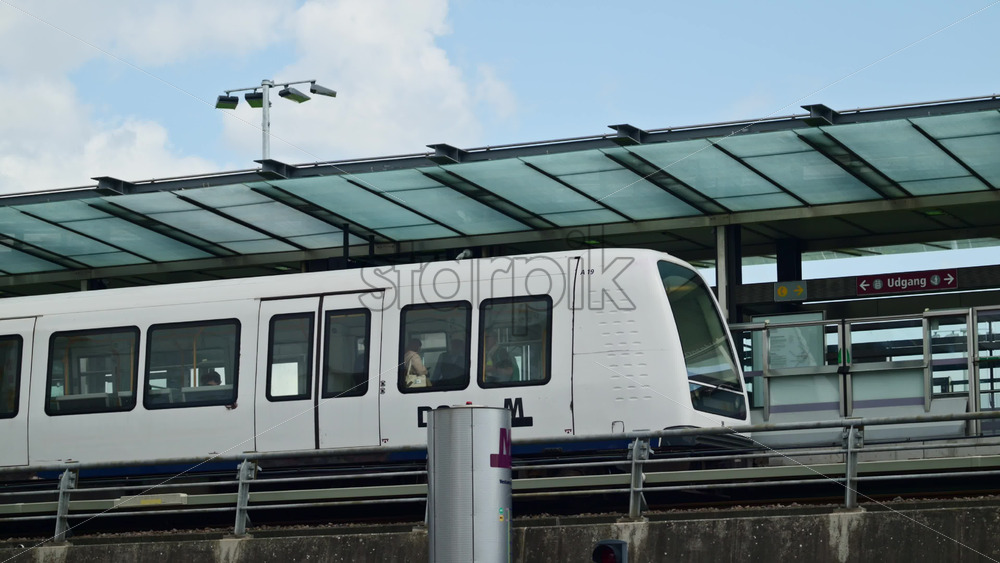 Copenhagen, Denmark – August 4, 2025: Driverless Metro train arriving at an elevated station platform under a modern glass roof Royalty Free Stock Video Footage
