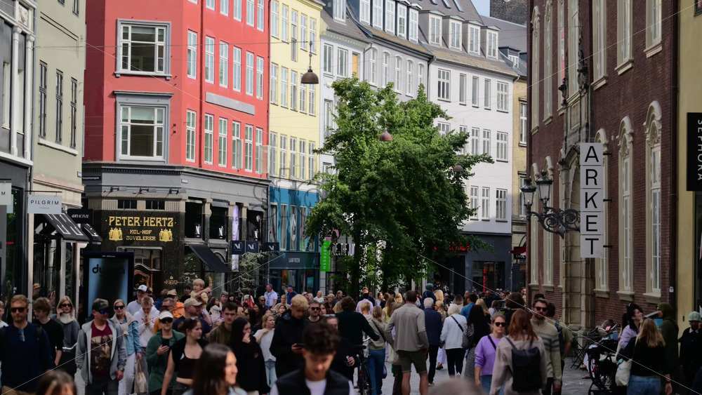 Home » Shop » 1 Video » Video – Copenhagen, Denmark – August 4, 2025: Row of traditional old street buildings with stores at street level. Pedestrians walking by and shopping