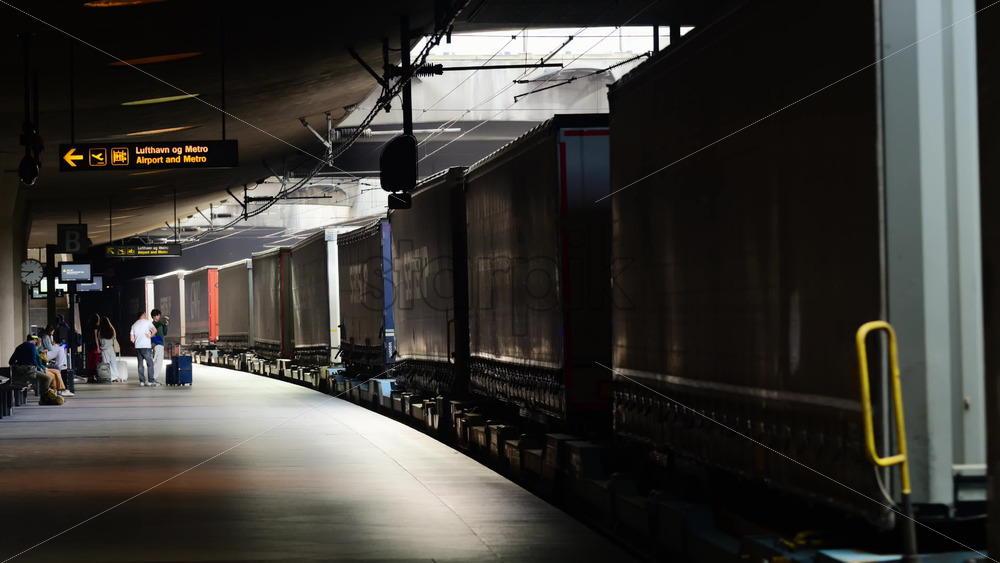 Copenhagen, Denmark – August 5, 2025: Passengers waiting as a freight train, loaded with shipping containers, pulls into a dark station Royalty Free Stock Video Footage