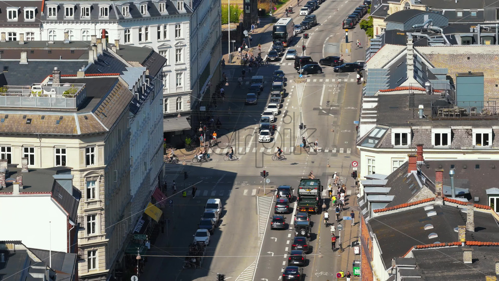 Copenhagen, Denmark – August 6, 2025: Aerial drone view of cars, buses, and bicycles navigating through heavy traffic during rush hour Royalty Free Stock Video Footage