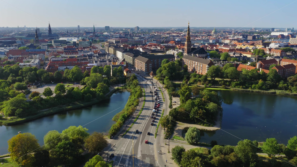 Copenhagen, Denmark – August 6, 2025: Aerial drone view of Sortedams So lake and Osterbro rooftops leading towards the historic city center Royalty Free Stock Video Footage