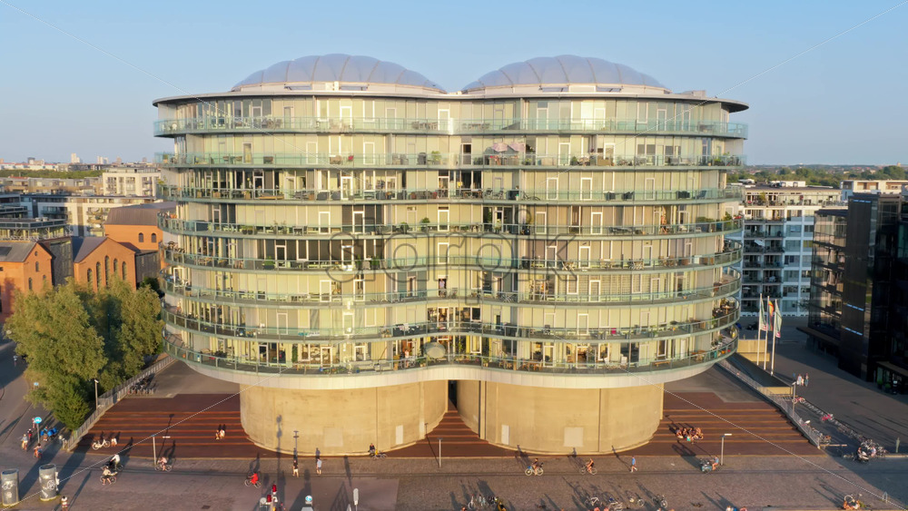 Copenhagen, Denmark – August 6, 2025: Aerial drone view of the Gemini Residence, futuristic round glass building built on old silos, standing at the waterfront of Islands Brygge Royalty Free Stock Video Footage