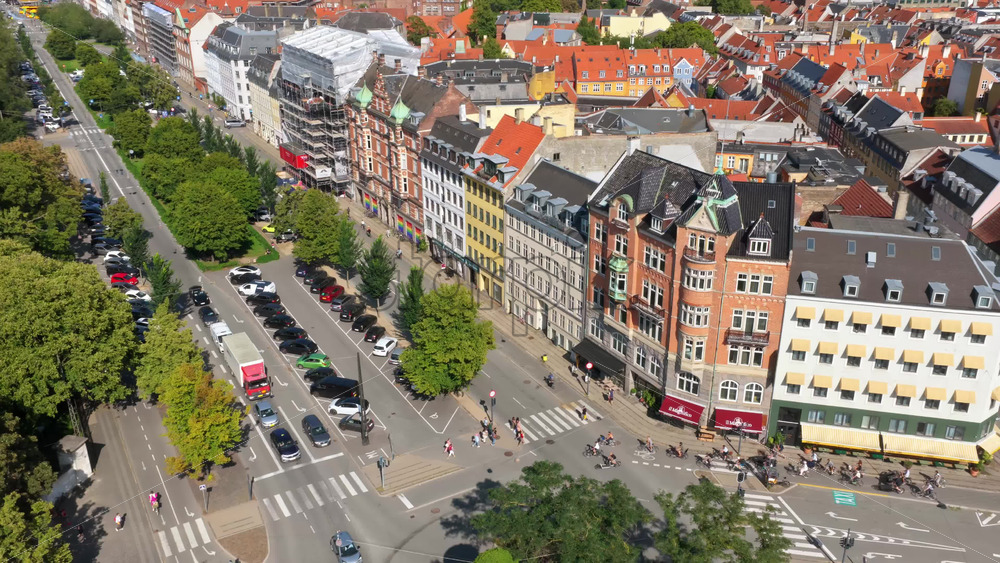 Copenhagen, Denmark – August 6, 2025: Aerial drone view of the historic brick buildings alongside modern roads filled with cars and cyclists Royalty Free Stock Video Footage