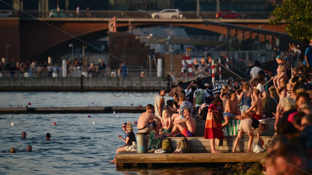 Aerial drone view of people sunbathing and swimming along the lively promenade by the harbor at the Islands Brygge waterfront, Copenhagen, Denmark Royalty Free Stock Video Footage