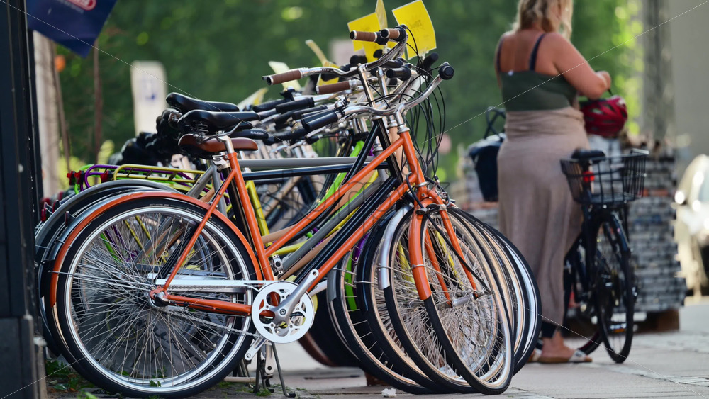 Home » Shop » 1 Video » Video – Copenhagen, Denmark – August 6, 2025: Row of city bicycles parked for sale on a street while a woman prepares to ride a bike