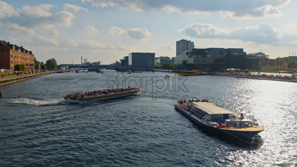 Copenhagen, Denmark – August 6, 2025: Aerial drone view of boats and a canal tour passing under Inderhavnsbroen pedestrian and bicycle bridge Royalty Free Stock Video Footage