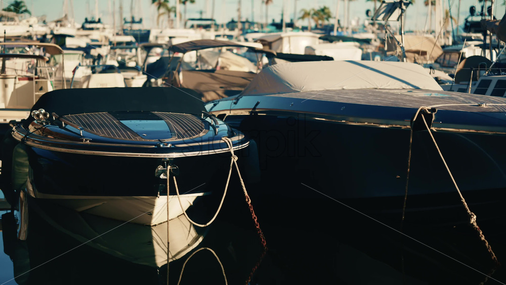 Covered motorboats docked closely together at a marina Royalty Free Stock Video Footage