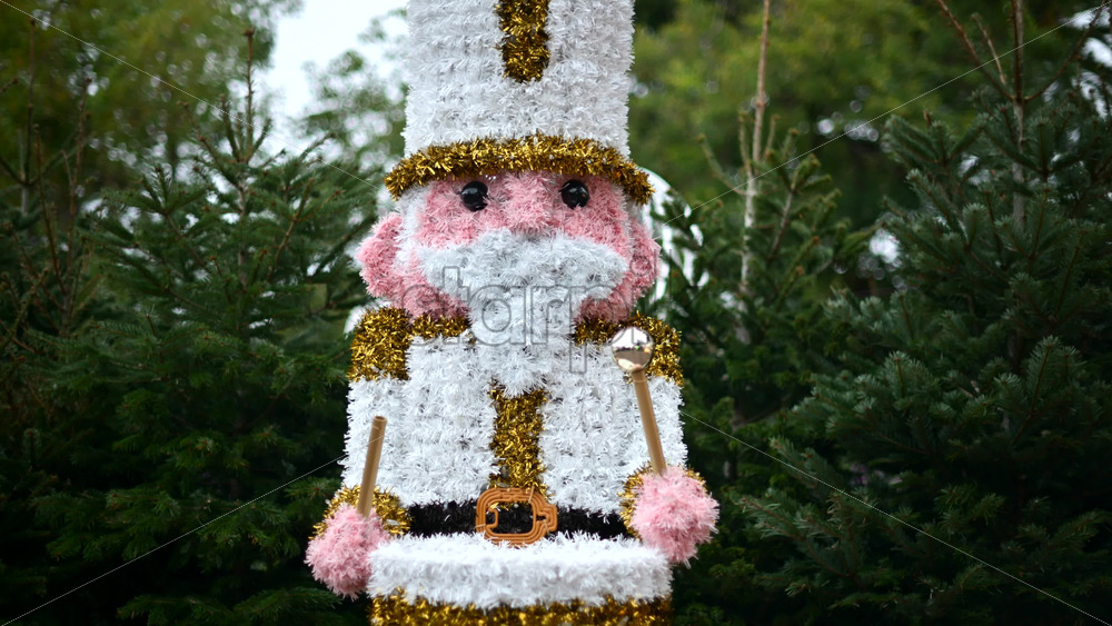 Decorative Christmas nutcracker soldier figure displayed outdoors with trees in the background Royalty Free Stock Video Footage