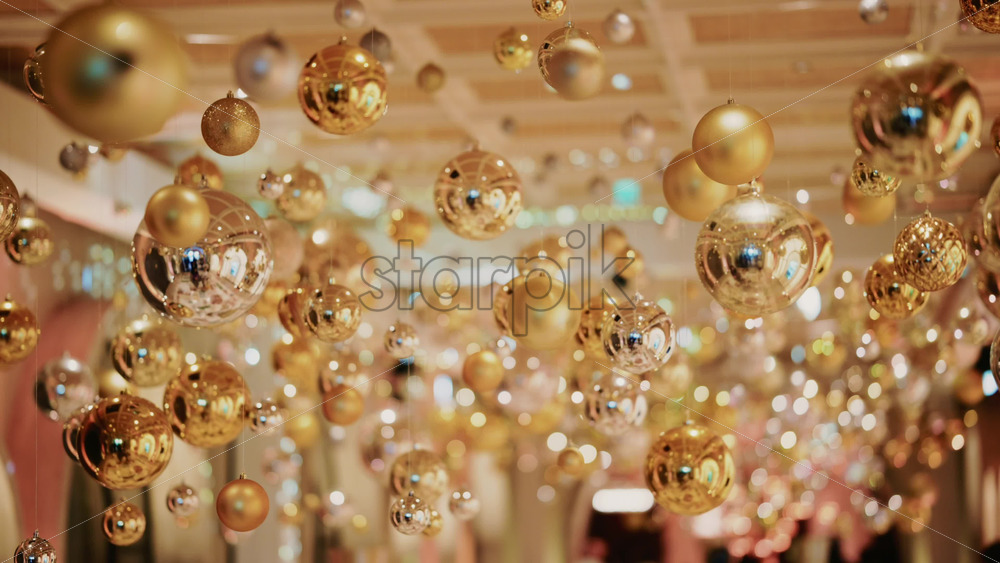 Golden Christmas baubles hanging in a softly illuminated indoor corridor, creating a warm and magical holiday ambiance Royalty Free Stock Video Footage