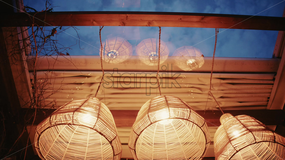 Decorative wicker lamps hanging indoors with warm light with a cozy and stylish interior atmosphere Royalty Free Stock Video Footage