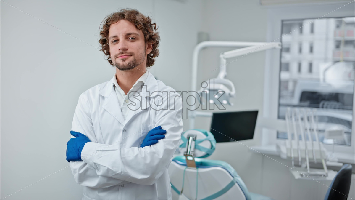 Home » Shop » 1 Video » people » Video Dentist wearing a scrub and standing and smiling in a dental cabinet, in front of a window