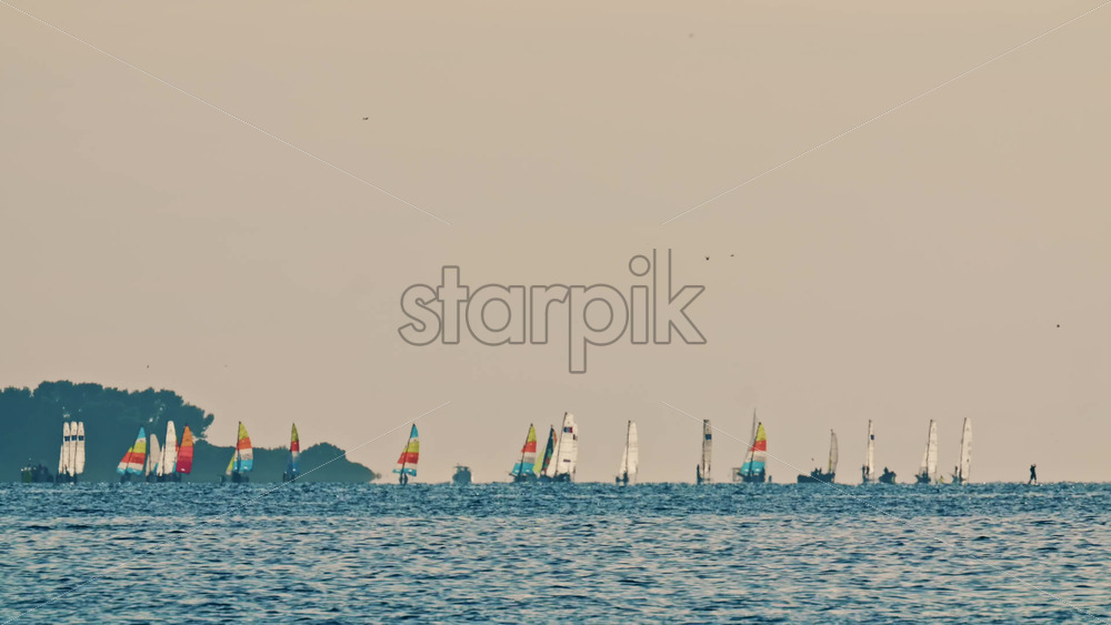 Wide shot of two sailboats navigating the calm blue sea under a pale sky Royalty Free Stock Video Footage