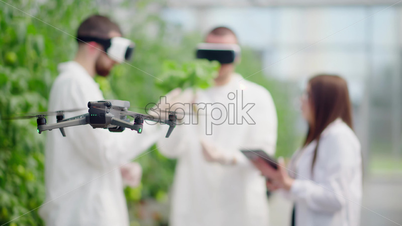 VIDEO Drone filming three laboratory technicians in white coats wearing Virtual Reality headset, working with plants grown with the Hydroponic method in a greenhouse Royalty Free Stock Video Footage