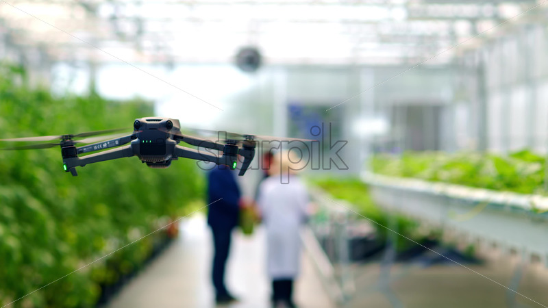 VIDEO Drone filming three laboratory technicians in white coats working with plants grown with the Hydroponic method in a greenhouse Royalty Free Stock Video Footage
