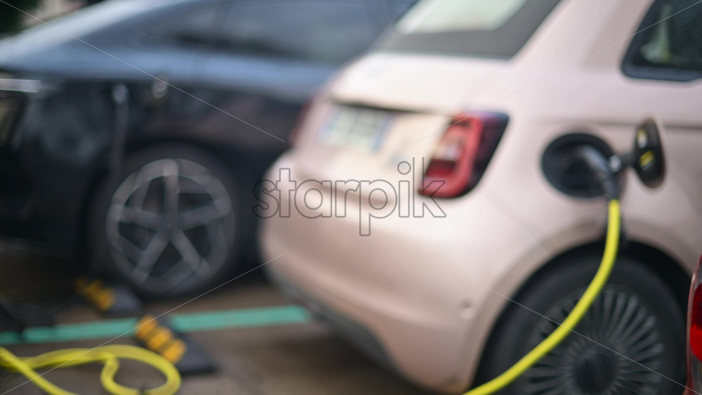 Close up view of an electric vehicle charging cable connected to a white car Royalty Free Stock Video Footage