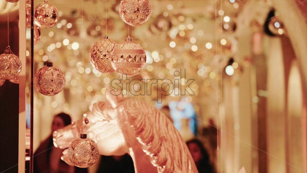 Home » Shop » 1 Video » Video – Elegant close-up of a decorative horse statue displayed inside a warmly lit hallway filled with golden holiday lights and ornaments