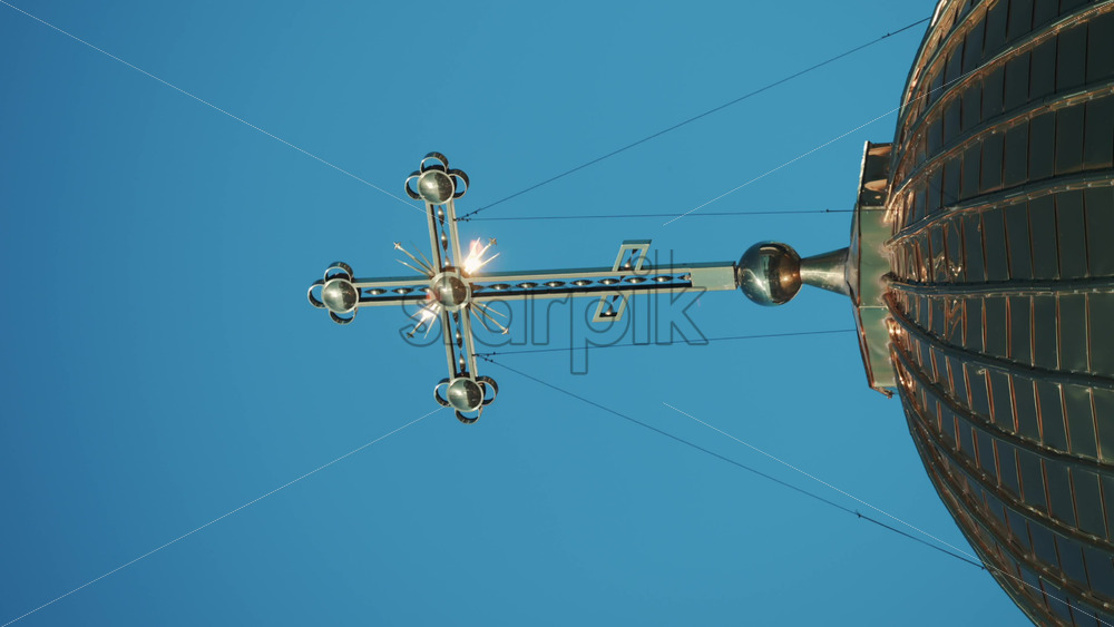 Elegant metallic church cross glowing under clear blue sky. Vertical Royalty Free Stock Video Footage