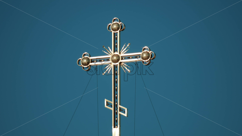 Elegant metallic church cross glowing under clear blue sky. Vertical Royalty Free Stock Video Footage