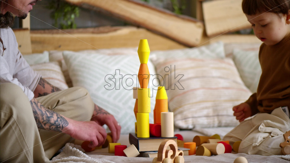 Video – Father playing with his son with colourful, ecological wooden toys on the bed