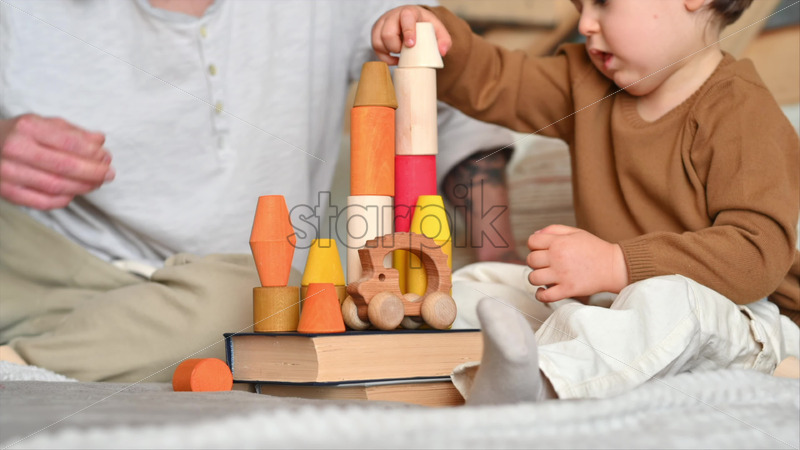 VIDEO Father playing with his son with colourful, ecological wooden toys on the bed Royalty Free Stock Video Footage