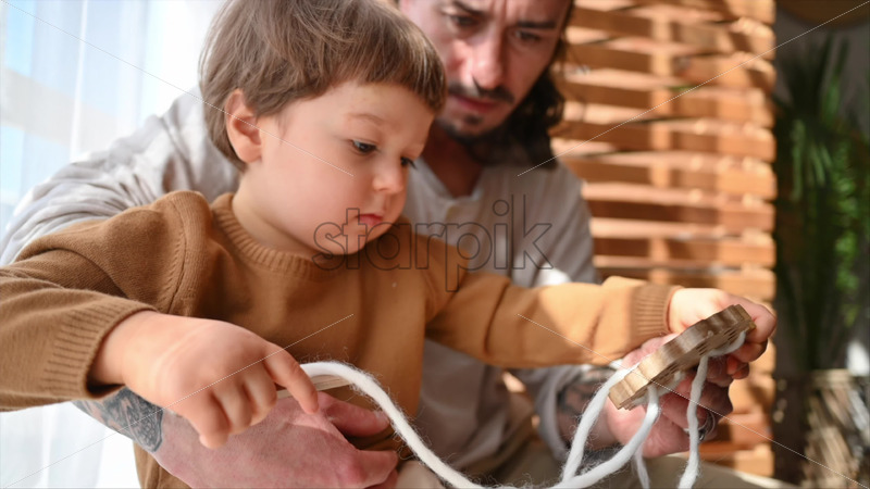 VIDEO Father playing with his son with ecological wooden toys near the window Royalty Free Stock Video Footage